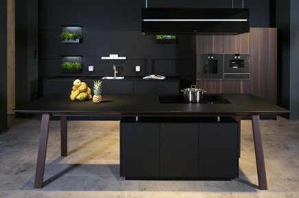 Induktionskochfeld macht's möglich: Kochfelder direkt in der Tischplatte. So kann eine Kochinsel gleichzeitig ein Esstisch sein. Das ist nicht nur gewitzt, sondern auch platzsparend. Das Tolle: An diesem Tisch kann man sitzen und kochen, denn an den Seiten herrscht Beinfreiheit, nur unter dem Kochfeld befindet sich ein vom Design her passender bodentiefer Unterbauschrank.